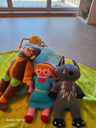 Vi har lest bok om rødhette og ulven, malt bilder fra boka, hatt litt skoleoppgaver i leksepermen vår, og lekt med eventyrfigurene fra fortellingen. Det har vært mye fin språktrening og spennede lek.