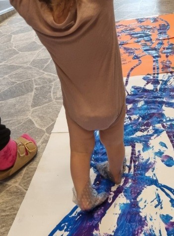 Denne dagen ble det lagt til rette for utforsking gjennom både nytt og kjent materiale – bobleplast og maling. Ved å feste bobleplast under føttene ble aktiviteten til en lekende og sanselig opplevelse, og barna fikk kjenne, høre og se hvordan materialet oppførte seg mens de beveget seg rundt. Dette var noe helt nytt for dem, og det skapte både undring, glede og kroppslig utforsking.