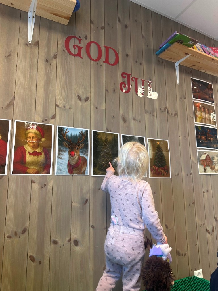 Vi har brukt november på å gjøre oss klare for juleperioden, samtidig som vi har hatt rom for lek og utforsking i barnas tempo. I samlingsstund og språkgrupper har vi hatt fokus på jul som kultur og tradisjon, og jaktet på den fine julestemningen. Inne på avdelingen har vi hengt opp illustrasjoner som viser ulike situasjoner knyttet til julefeiring – superpopulært! Dette har skapt engasjement og samtaler mellom barna, og illustrasjonene har i perioder fungert som et naturlig språkstimulerende møtepunkt der barna stopper opp og prater med hverandre og med oss voksne.