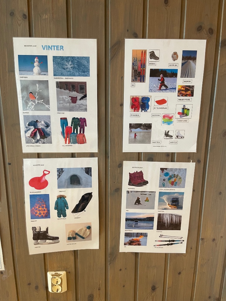 I samlingskroken har vi hengt opp plakater med bilder og vinterbegreper, og i samling har vi valgt eventyr, bøker og sanger som handler om vinter.