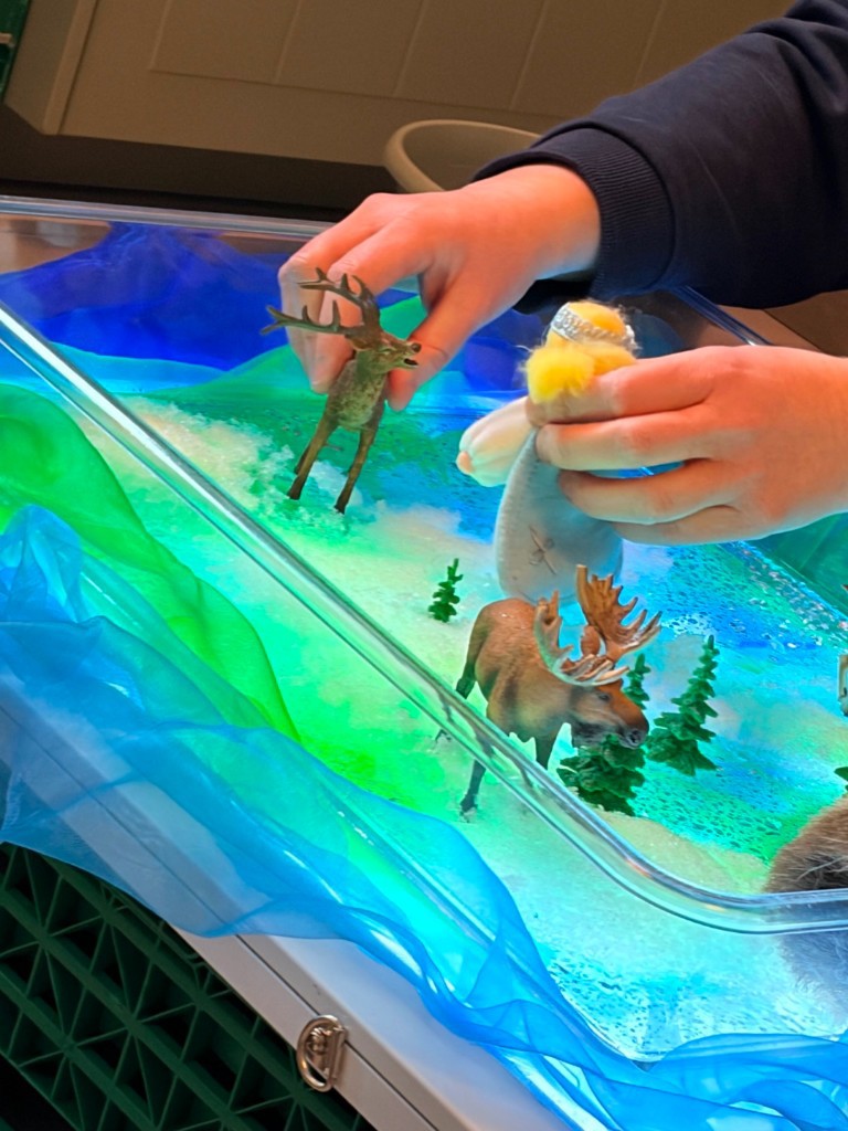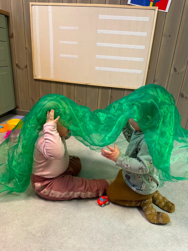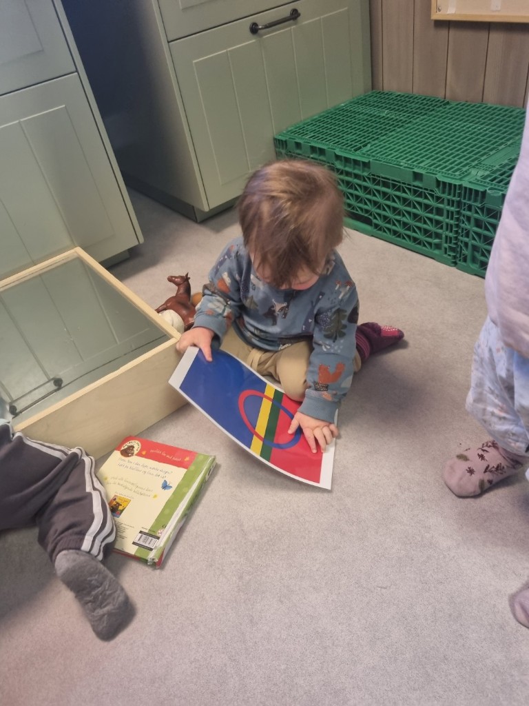 I løpet av prosjektperioden har barna fått møte samisk kultur gjennom sanselige, estetiske og lekende aktiviteter. Målet har vært å skape trygge og positive erfaringer med kulturelt mangfold, og introdusere sentrale elementer fra samisk tradisjon og uttrykk – tilpasset aldersgruppen 1–2 år. Vi har blant annet sett på fargene i det samiske flagget, hatt samling om reinsdyr hvor vi hørte på lydene til reinsdyret, kjente på reinsdyrpels og hørt eventyr fra samisk kultur. Joik er en tradisjonell samisk sangform, og en ny måte å høre musikk på for mange. Vi har og prøvd oss på å synge Fader Jakob på samisk, dette var litt vanskelig og litt morsomt 😊