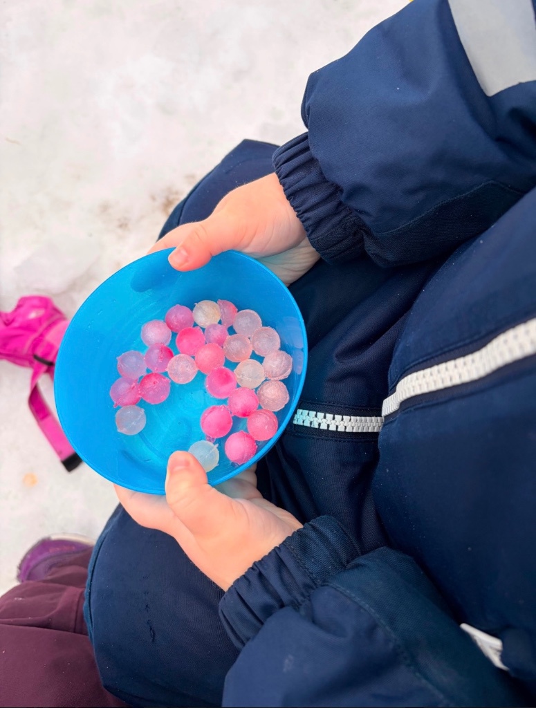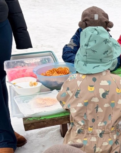 - Nistedag/turdag – Her deler vi gruppen hovedsakelig i to – 9 barn og 3 voksne på hver gruppe – så går vi hver vår tur eller leker ute i barnehagen. Nå som det blir litt varmere temperaturer, kan vi igjen ta med oss sekken og spise på tur. I vinter med minusgrader og kald luft, da har vi valgt å gå litt kortere turer og kommet tilbake til barnehagen for å spise inne.
