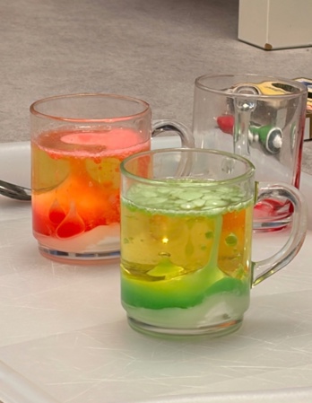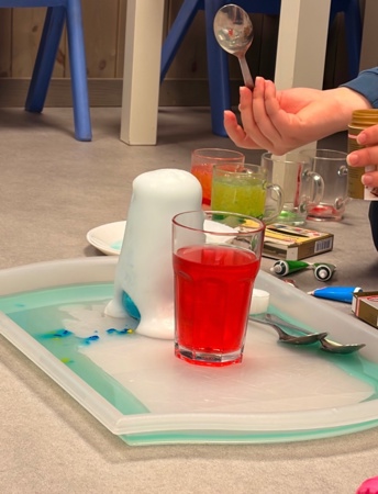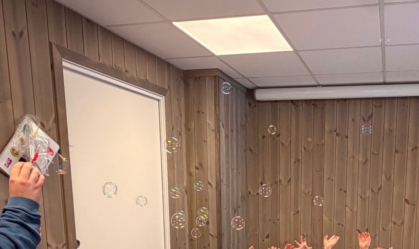 Klokken 09.00 var det tid for Iselin sin siste samlingsstund for oss, det ble en forskersamling med lavalampe, vulkan og forskning med lys. På forskning med lys fyller man litt vann i ei skål eller to, putter oppi konditorfarge og rører litt rundt, setter oppi et telys og tenner på lyset, spruter litt parfyme i et glass og setter glasset over lyset, lyset slukker og vannet spruter opp i glasset. Samlingen ble avsluttet med såpebobler.