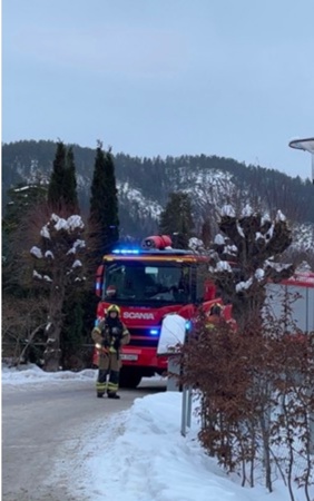Brannbilen kom, men ingen Bjørnis. Kan være lurt å ha litt godt med sokker i skiftekurven, dersom det skulle oppstå flere brannøvelser (planlagt, uplanlagt, varslet og uvarslet) mens det ennå er vått/kaldt i bakken.