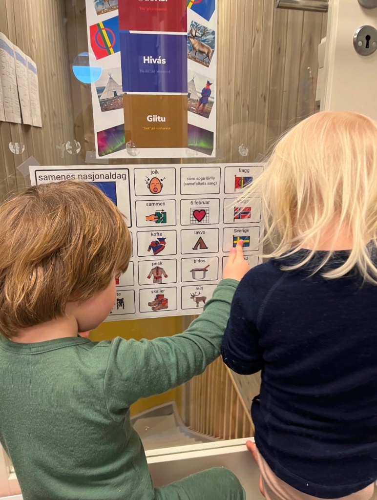 Fagområdet nærmiljø og samfunn skal omfatte kjennskap til samisk språk, kultur og tradisjon og kjennskap til nasjonale minoriteter. Personalet skal gjøre barna kjent med samisk kultur og levesett og knytte det samiske perspektivet til merkedager og hverdagsliv, kunst og kultur og mattradisjoner (R-17)